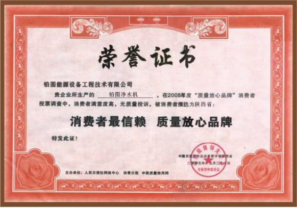 鉑圖能源設備工程有限公司,所生產的“鉑圖凈水機”。榮獲2005年度“消費者最信賴、質量放心品牌”稱號。
